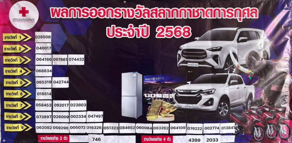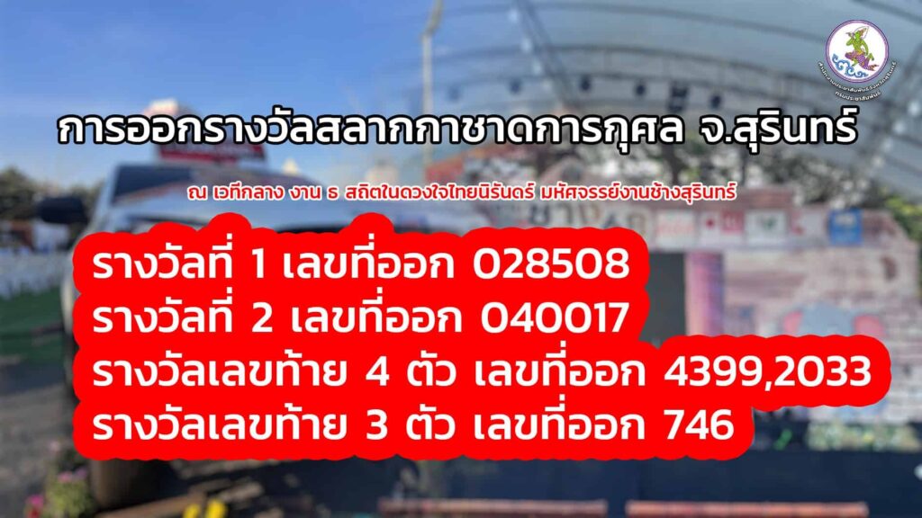 ผลการออกรางวัลสลากกาชาดการกุศล จังหวัดสุรินทร์ ประจำปี 2568 ออกรางวัลวันที่ 26 พฤศจิกายน 2568